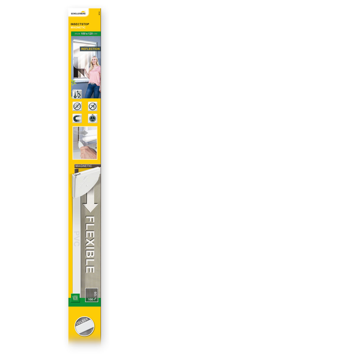 Schellenberg Fliegengitter-Magnetrahmen mit REFLECTION-Gewebe, weiß, 100 x 120 cm Von außen montierender Insekten-, Sicht- und Sonnenschutz für Fenster • Kombiniert Insekten-, Sicht- und Sonnenschutz • raumseitig anthrazitfarbenes Gewebe, gute Durchsicht nach draußen • Montage nur von außen am Blendrahmen des Fensters möglich • geringe Einbautiefe, passt hinter einen Rolladen • Befestigungsmaterial im Lieferumfang enthalten Das Fliegengitter REFLECTION mit Magnetrahmen ist ideal, um Insekten-, Sicht- und Sonnenschutz zu kombinieren. Das Gewebe ist auf der Außenseite aluminiumbeschichtet und sorgt so nicht nur für einen zuverlässigen Schutz vor Insekten, sondern auch für einen verbesserten Sichtschutz. Die glänzende, UV-stabile Oberfläche reflektiert zudem das einfallende Sonnenlicht, sodass sich der Wohnraum weniger erhitzt. Raumseitig ist das Gewebe anthrazitfarben und ermöglicht so eine gute Durchsicht nach draußen. Das Insektenschutz-Komplettset besteht aus einem reflektierenden Fliegengitter, einem beweglichen Magnetrahmen und benötigtem Montagezubehör. Das Insektenschutzgewebe wird in den magnetischen Spannrahmen eingekedert und anschließend mithilfe eines selbstklebenden Magnetstreifens von außen am Blendrahmen des Fensters befestigt. Die magnetische Befestigung ist nur möglich, wenn Sie von außen Zugang zum Fenster haben. Der Fliegengitter-Magnetrahmen kann jederzeit abgenommen oder angeheftet werden. Die Maße können bei Bedarf individuell angepasst werden. Sollte das Gewebe verschmutzt sein, ist es bis 30 °C waschbar. Das Komplettset passt mit einer geringen Einbautiefe von 10 mm hinter die meisten Rolläden. Unterstützende Halterungen für besonders festen Halt, z. B. bei starkem Wind, sind im Lieferumfang enthalten. Technische Daten • Maße: 100 x 120 cm • Rahmenfarbe: Weiß • Profilmaterial: PVC • Gewebematerial: aluminiumbeschichtetes Polyestergewebe • Gewebefarbe: Anthrazit/Aluminium • Befestigung: Klebe-/Magnetbefestigung (nur von außen möglich) • Profiltiefe: 10 mm • Reinigung des Rahmens: abwaschbar • Reinigung des Gewebes: waschbar bis 30 °C
