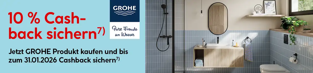 Im Aktionszeitraum 01.10.2025 bis 31.01.2026 erhalten Sie 10 % Cashback auf alle GROHE Produkte – ab einem Einkaufswert von 150 € (maximal 3.000 €).